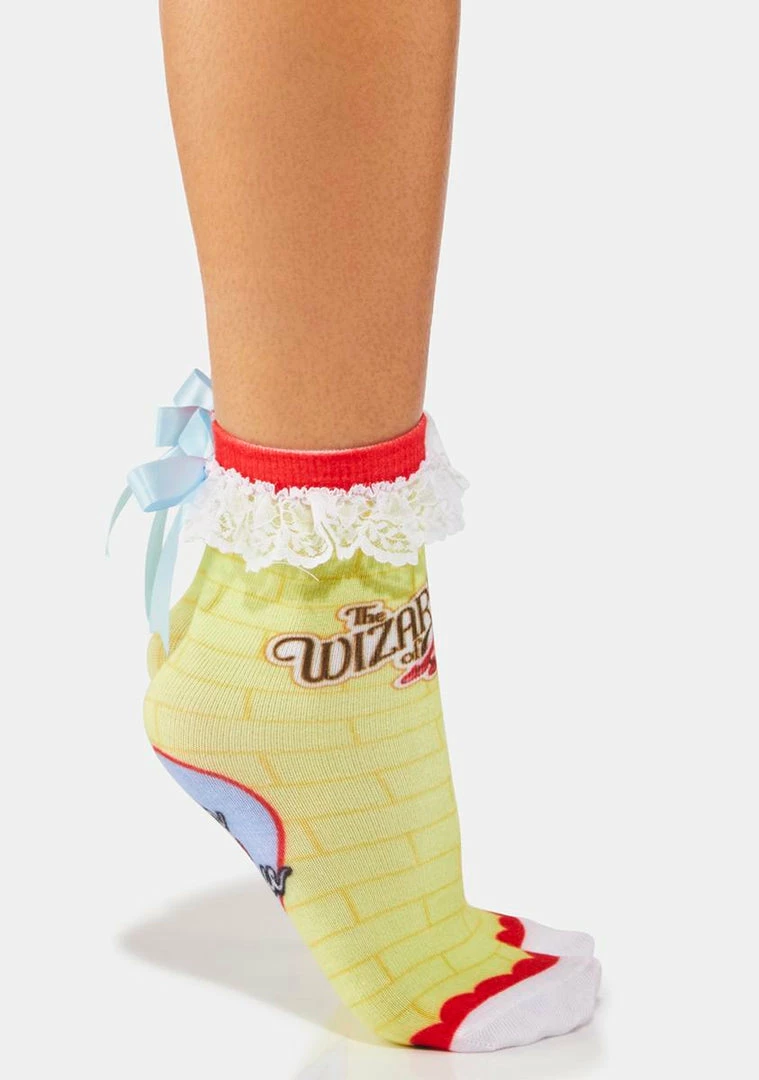 cuz follow the yellow brick road. These ankle socks have a yellow brick road pattern, a white lace trim, and a blue ribbon bow in the back.
