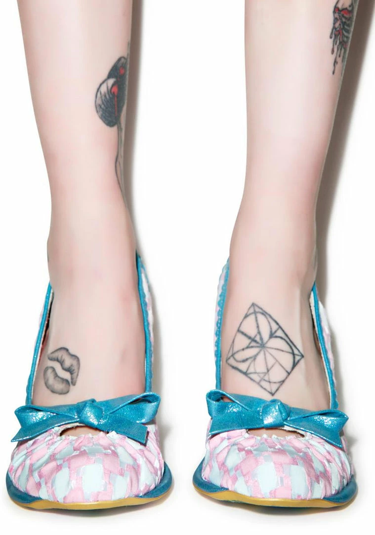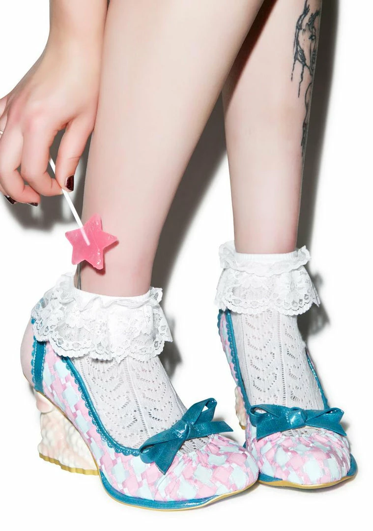 Irregular Choice Baah Baah Heels, for those into sheep thrills. These quirky little lamb heeled pumps feature a pair of 3 inch, hand painted resin sheep holding up yer heels so ya can keep a better eye on yer flock. The supa comfy padded interior and rounded toes will keep yer feet feeling fine, and the all over woven fabric upper is collected around the toe box; detailed with an adorable bow that matches the shelled trim. With ΓΒ<3 So CuteΓΒ embroidered across the heels, these little lambs really do speak for themselves.