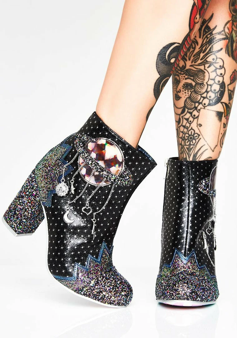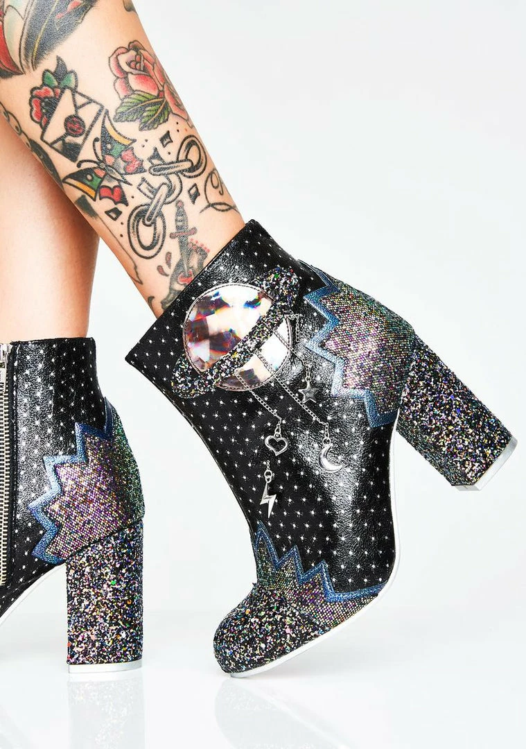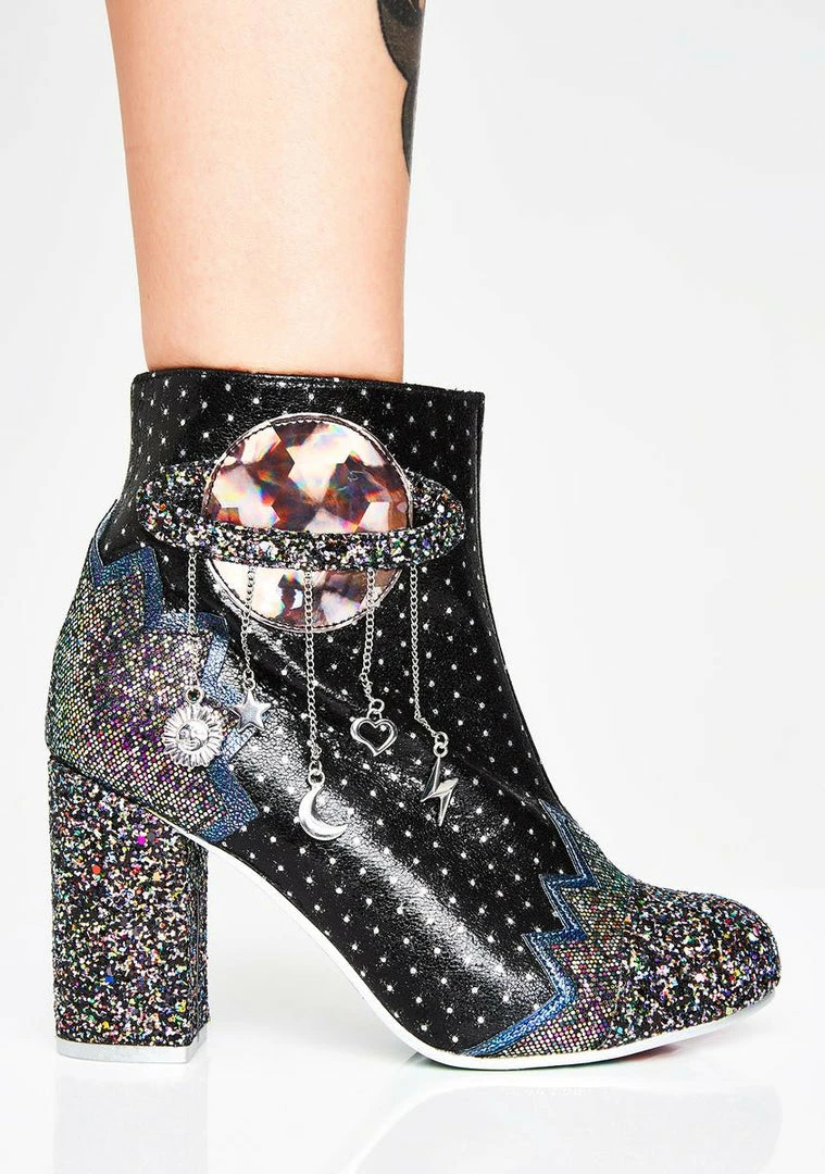 cuz ya one space age baddie babe! Take âem to another galaxy in these shimmerinâ booties that have a sikk Saturn graphic on the sides, danglinâ chain trinkets, and side zip closures.
