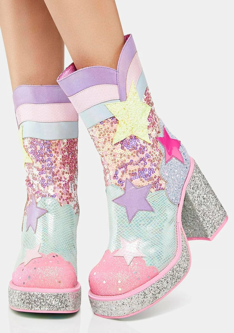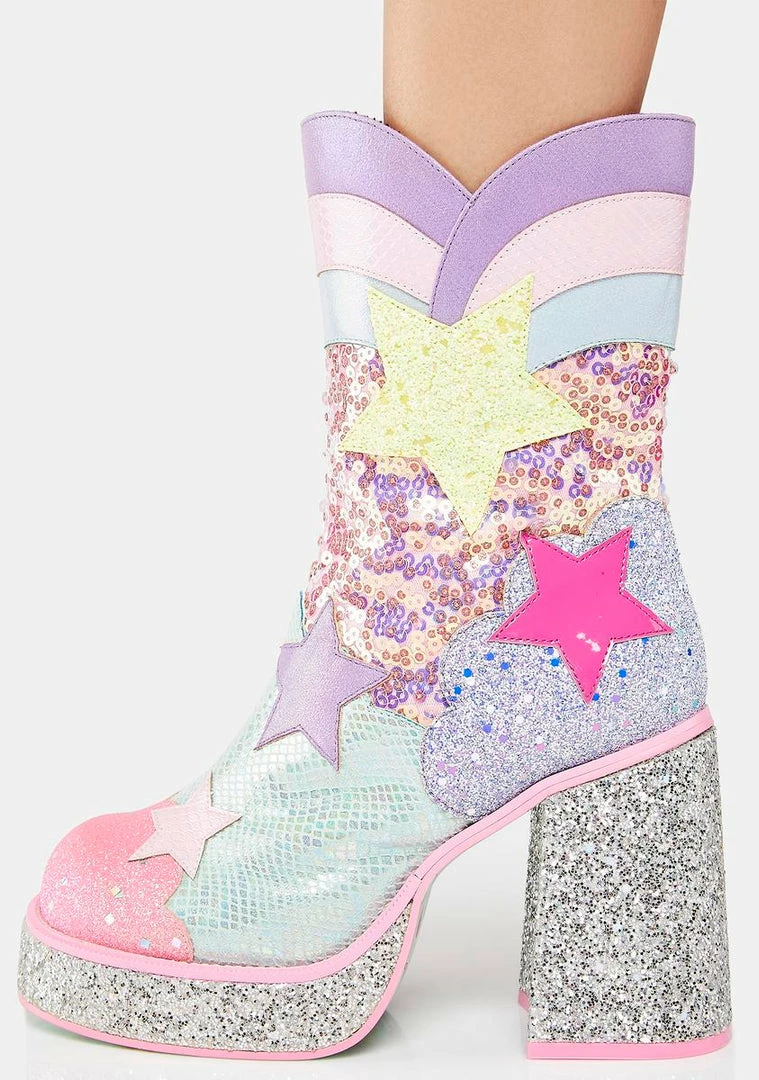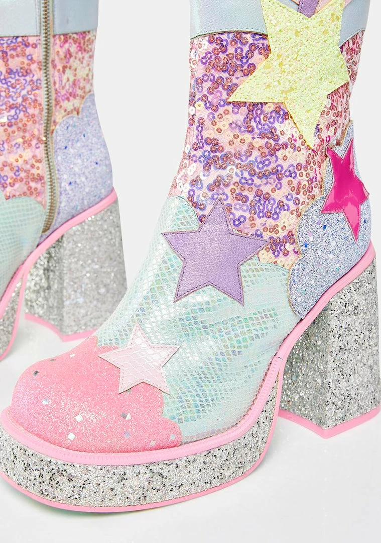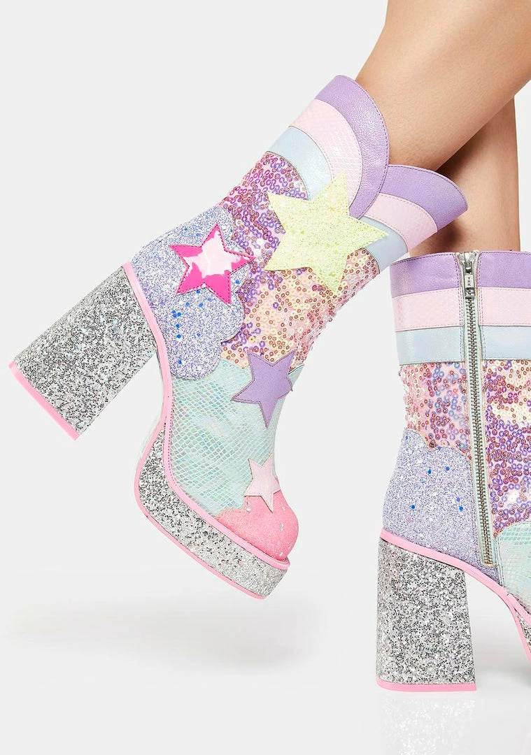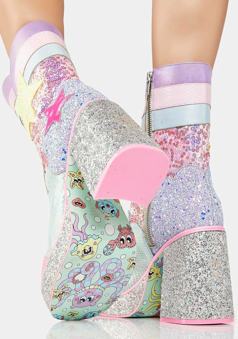 cuz if you can sparkle, the world shines through. These platform boots have a vegan leather construction, shimmering glitter detailing all over, a mermaid scale pattern, multicolored embossed stars all over, a scallop trim, a cushioned insole, glitter platform soles and block heels, and side zipper closures.