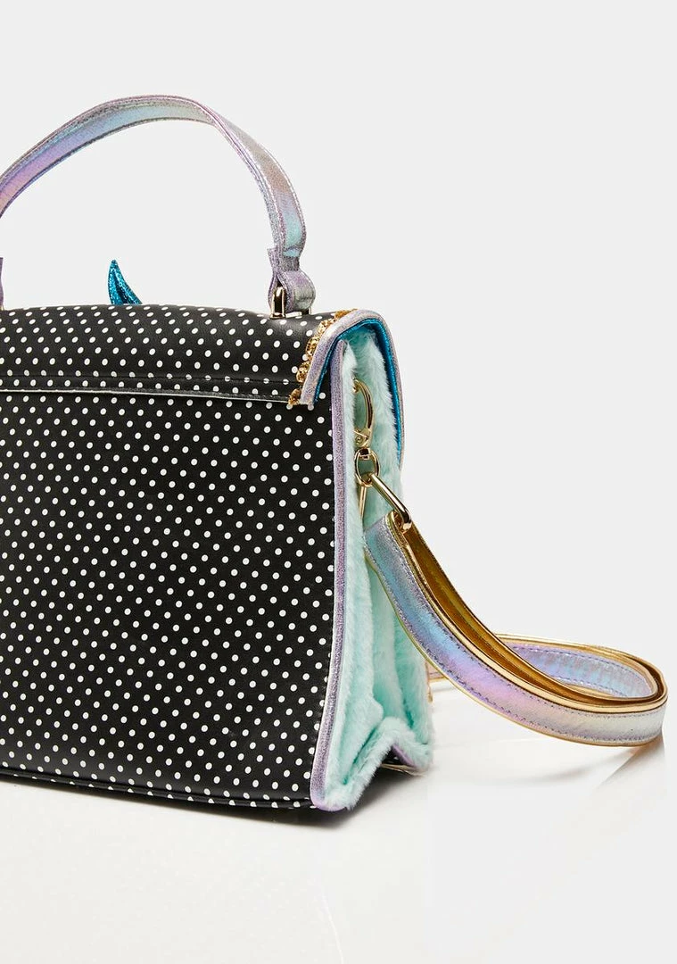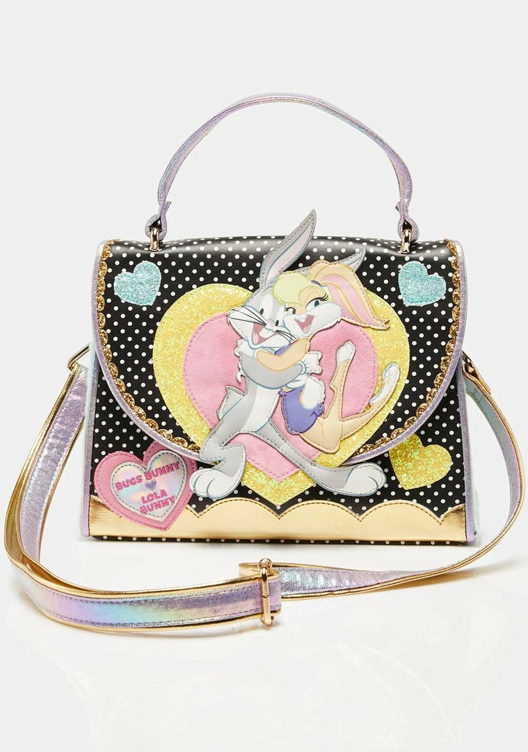 cuz you just found your soulmate! This crossbody handbag has a vegan leather and faux fur construction, Bugs Bunny, Lola, and hearts at front, a polka dot print, internal zipped pockets, a top handle, and a detachable and adjustable shoulder strap.
