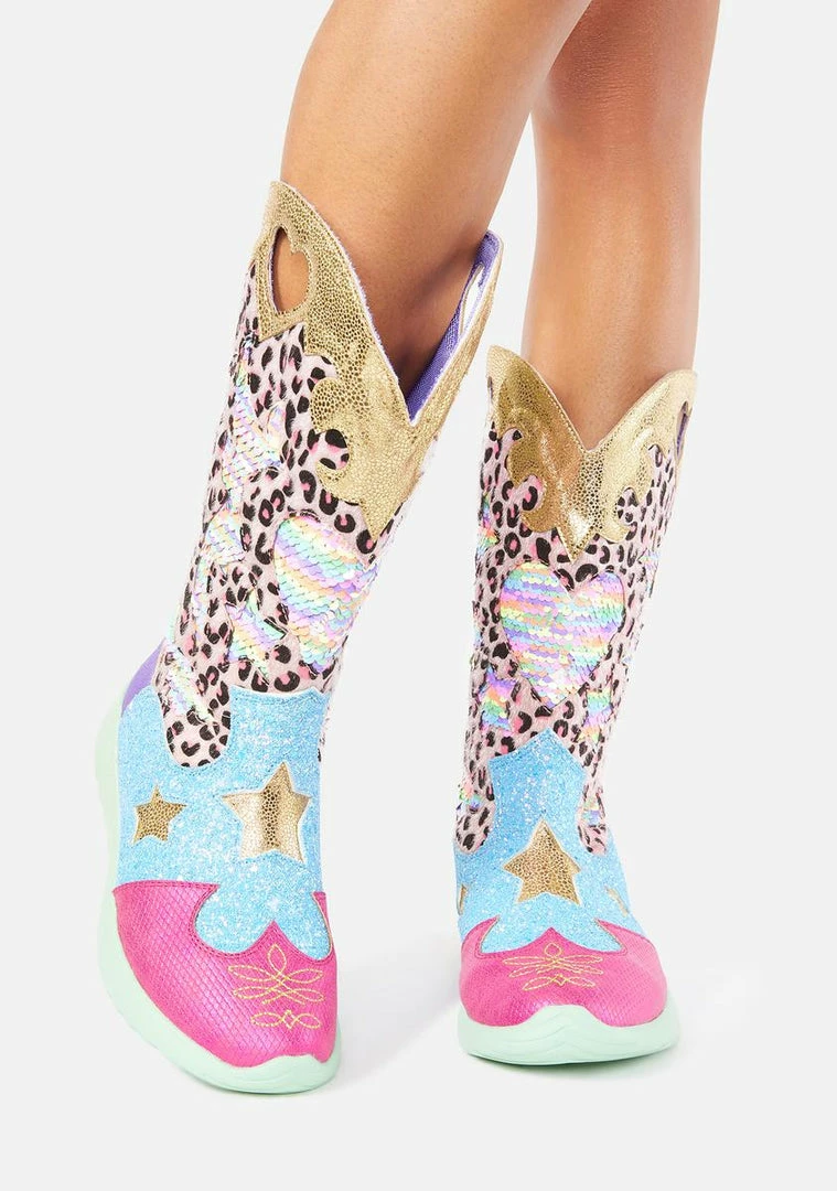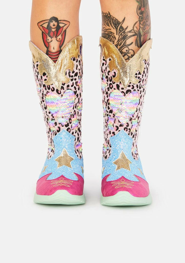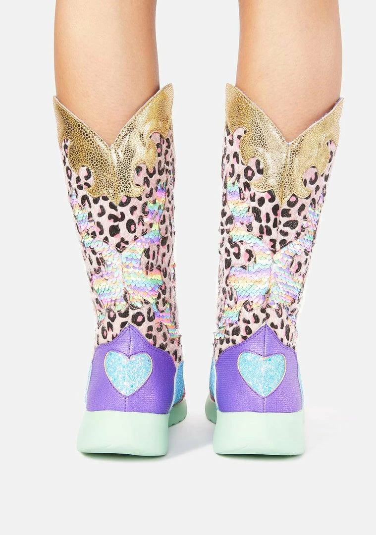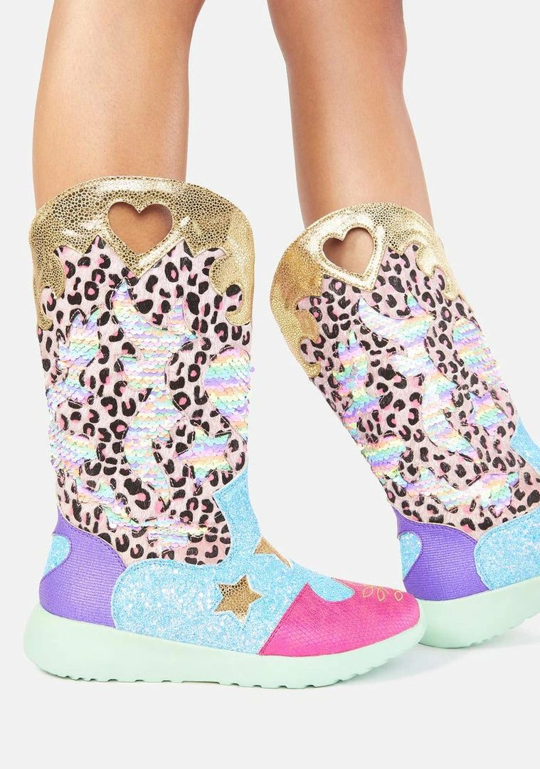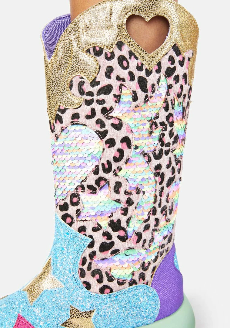 yee-haw, babe youâre lookinâ like a wild ride. These flashy cowboy boots have a colorful design featuring hearts, sequins and leopard print.