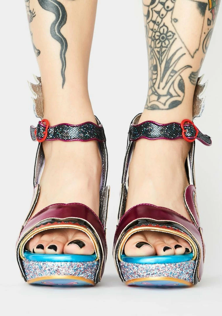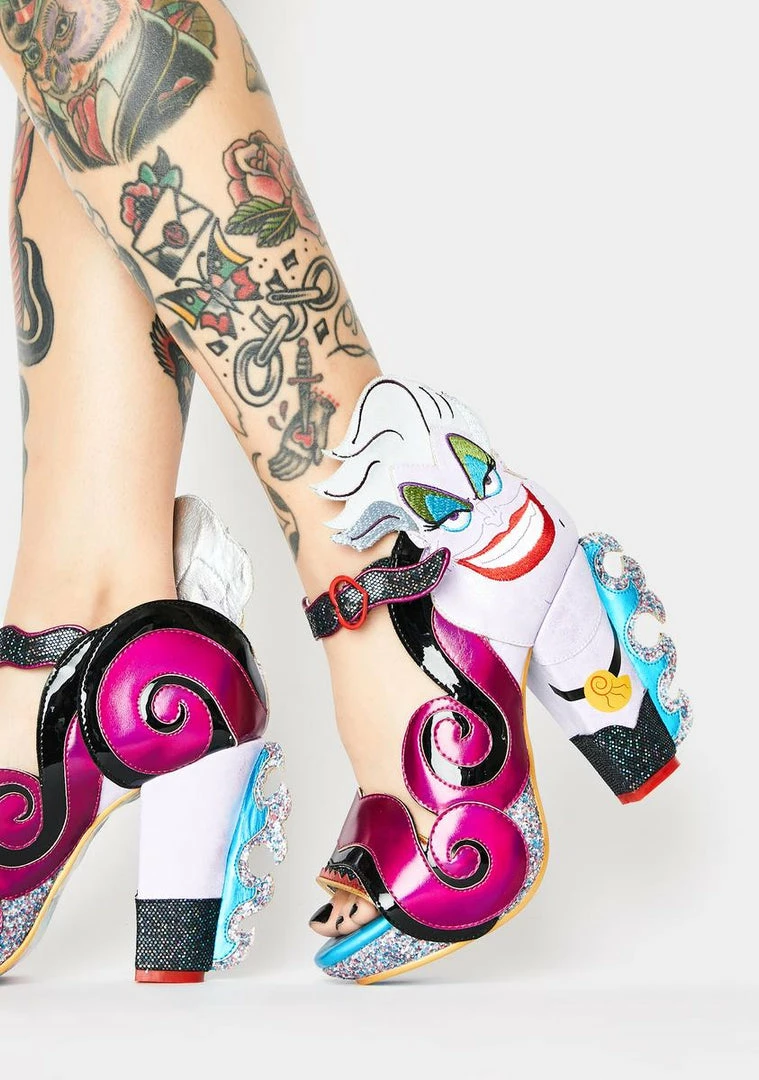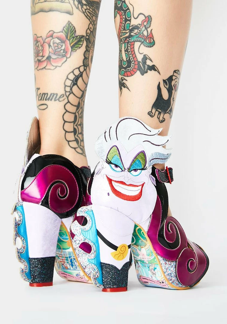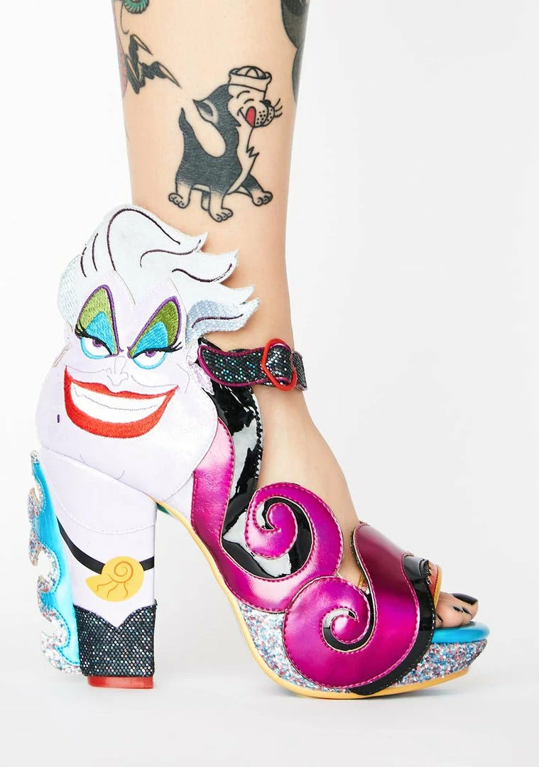 lifeâs full of choices, isnât it? Youâll be never a poor unfortunate soul in these wickedly elegant peep toe heels that have insanely intricate details like embroidered graphics of the iconic Disney villain, thicc glitter platforms, and heart-shaped ankle buckle closures.