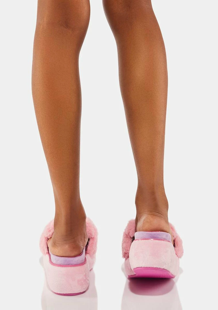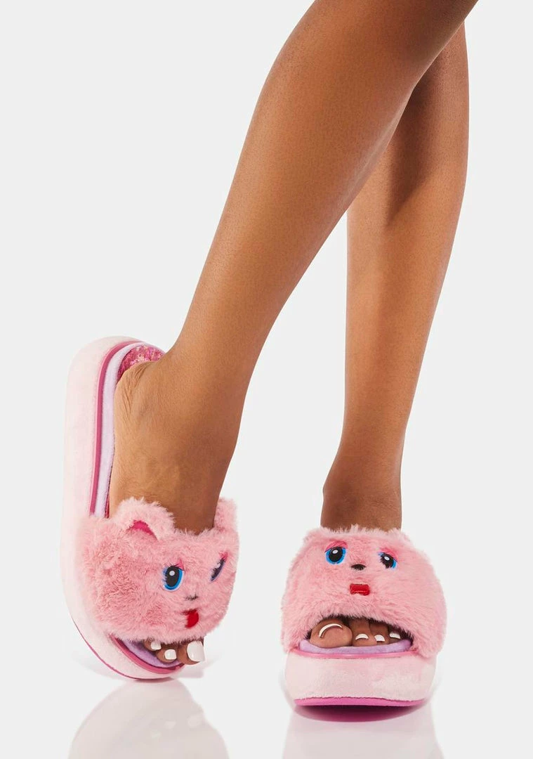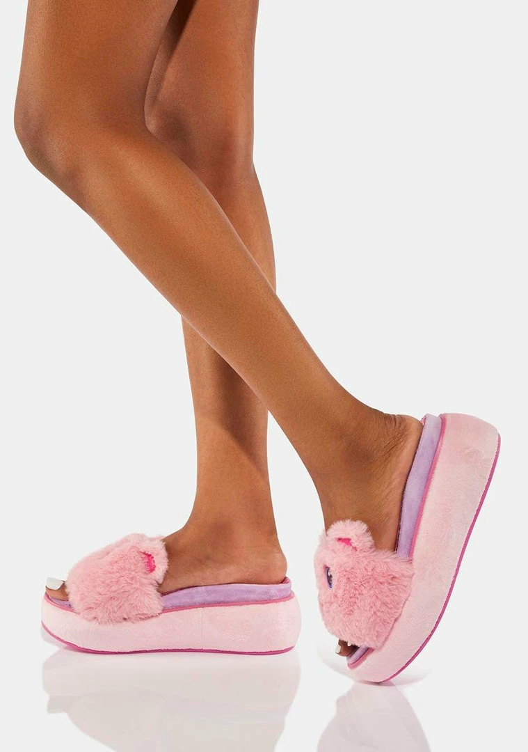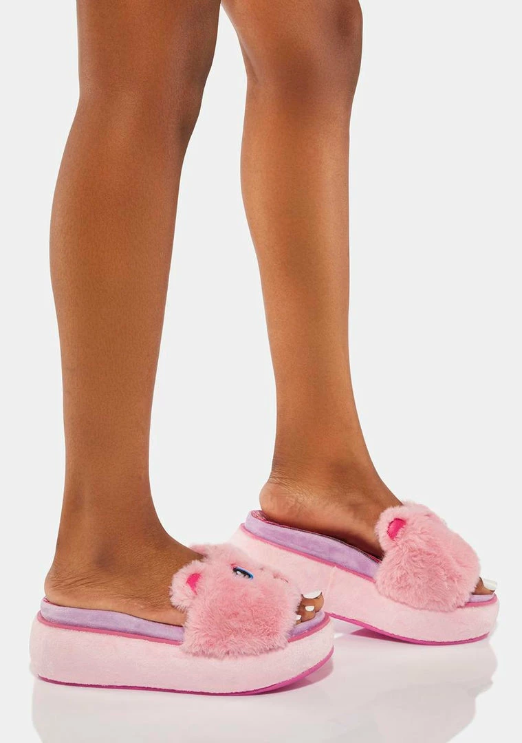 aren’t you adorable? These slide sandals have a fluffy design, wide toe straps with a teddy bear face, contrast trim, and platform soles.