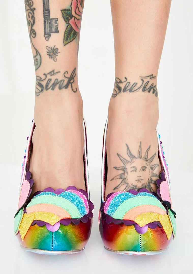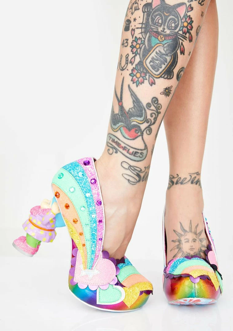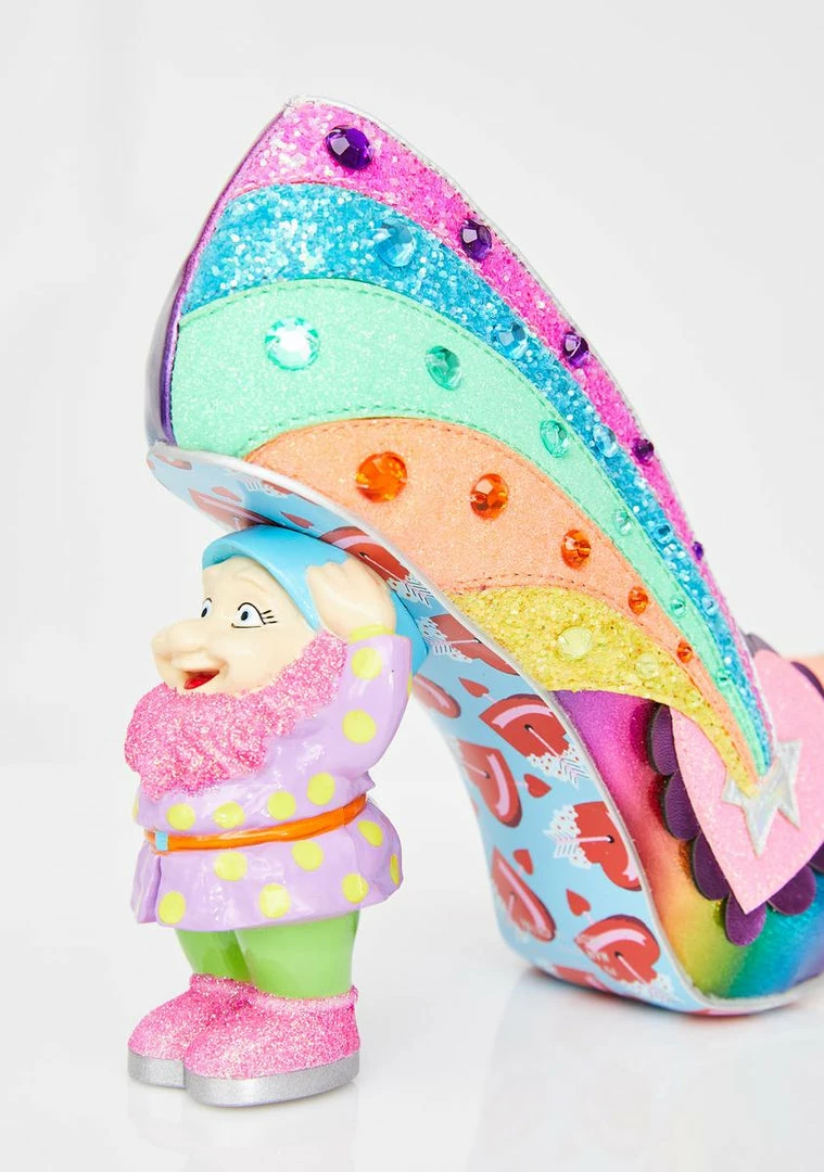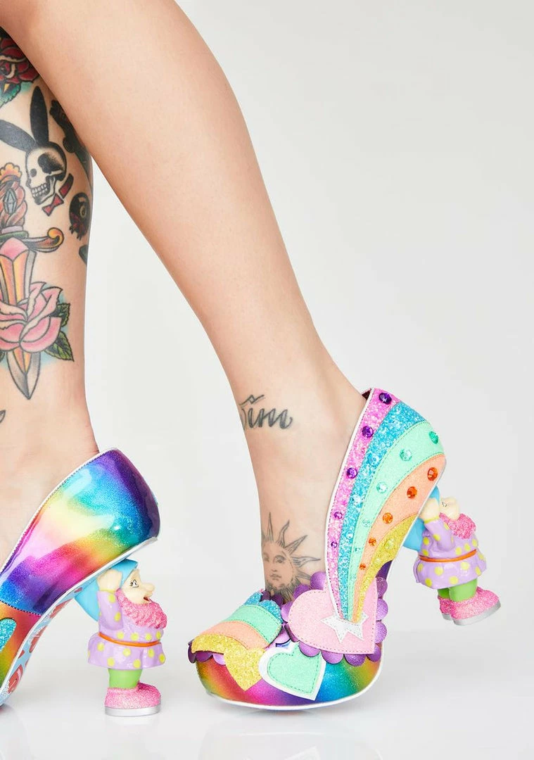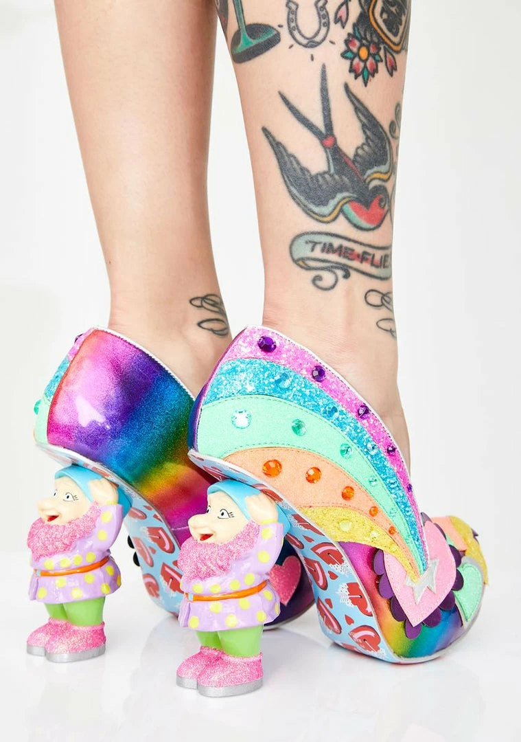 cuz you gnome whatΓ’ΒΒs up in fantasy land! These magical af heels have allover rainbow details, sparkles and gnome figurine heels.