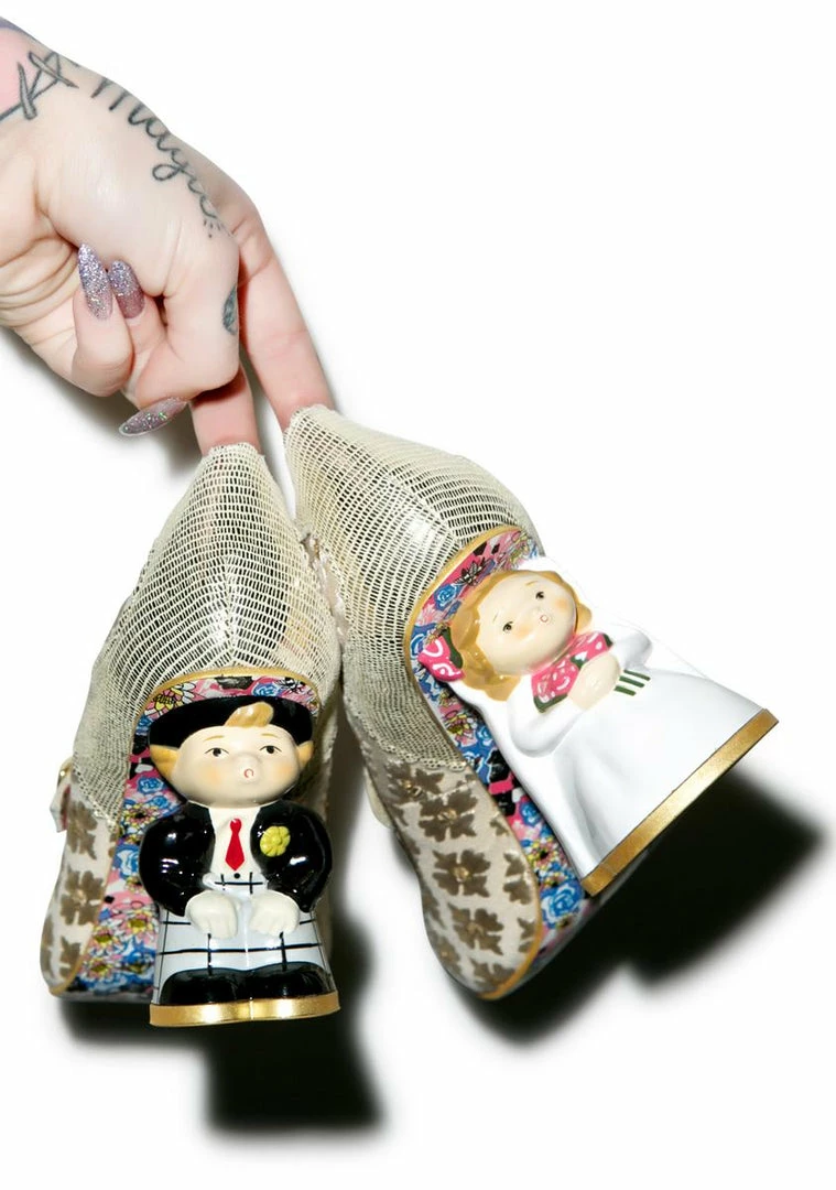 Irregular Choice I Love You Heels because you luv shoes so much, you want to marry them. These are a true match made in heaven with their hand painted 4 inch resin bride and groom heels that help ya get rise above everyone else. Say I do with the ΓΒI <3 YouΓΒ detailing embroidered and studded across the toe boxes, with an all over satin and sequin finish. Featuring an adjustable hook and loop closure, fabric lined interior, and scalloped trim, youΓΒll be in wedded bliss, unless another woman stealz them from you.