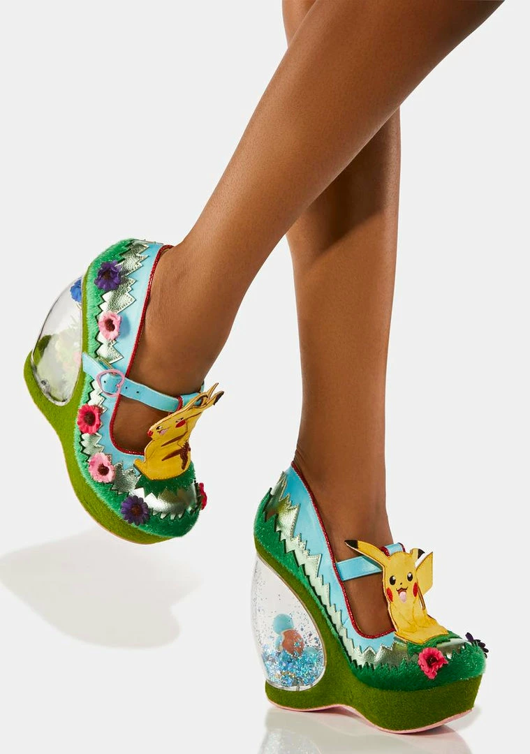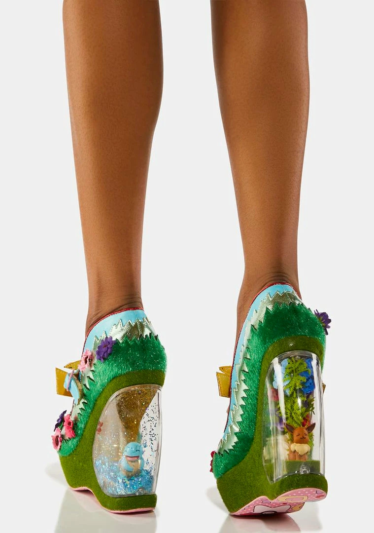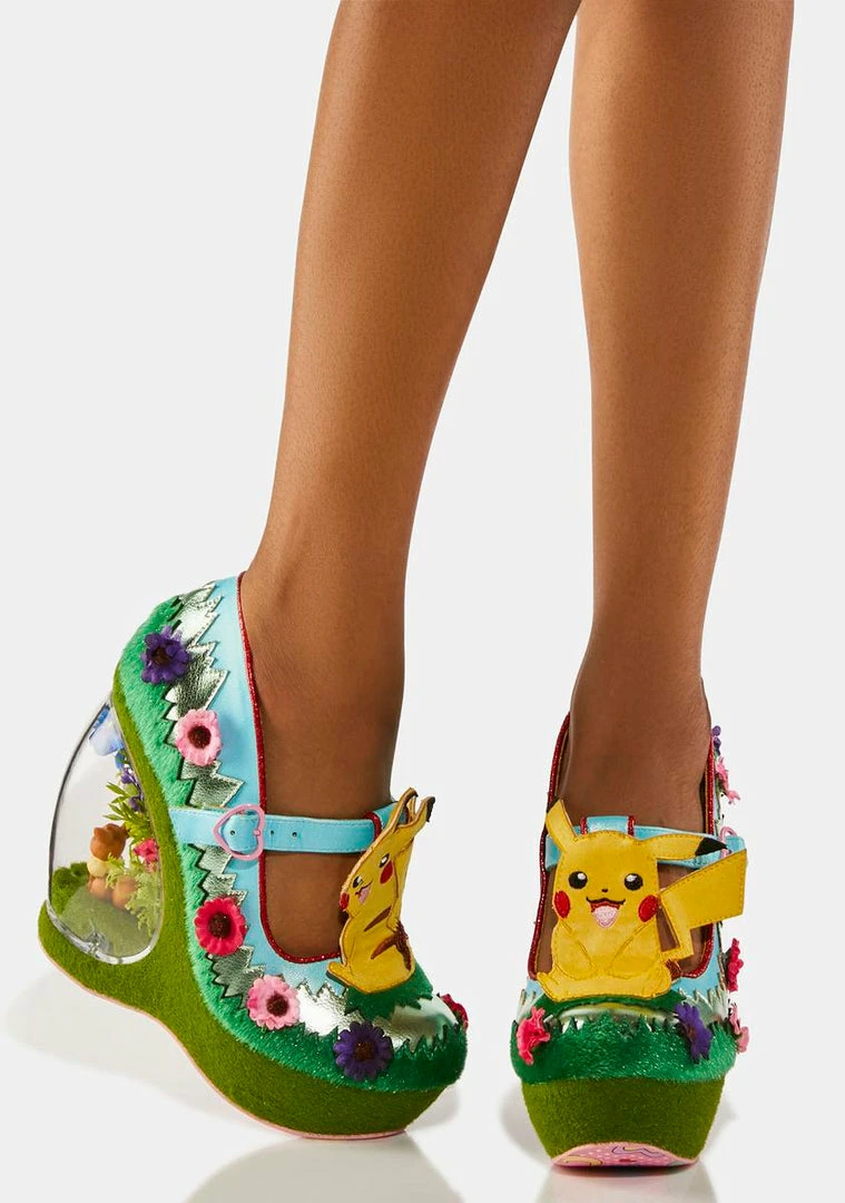 this must be a dream! These heels have vegan leather uppers with 3D flowers, fuzzy ‘grass’ paneling, T-bar straps with Pikachu appliques and buckle closures, and wedge heels with terrarium that contain Eevee and Squirtle in their own little habitats!