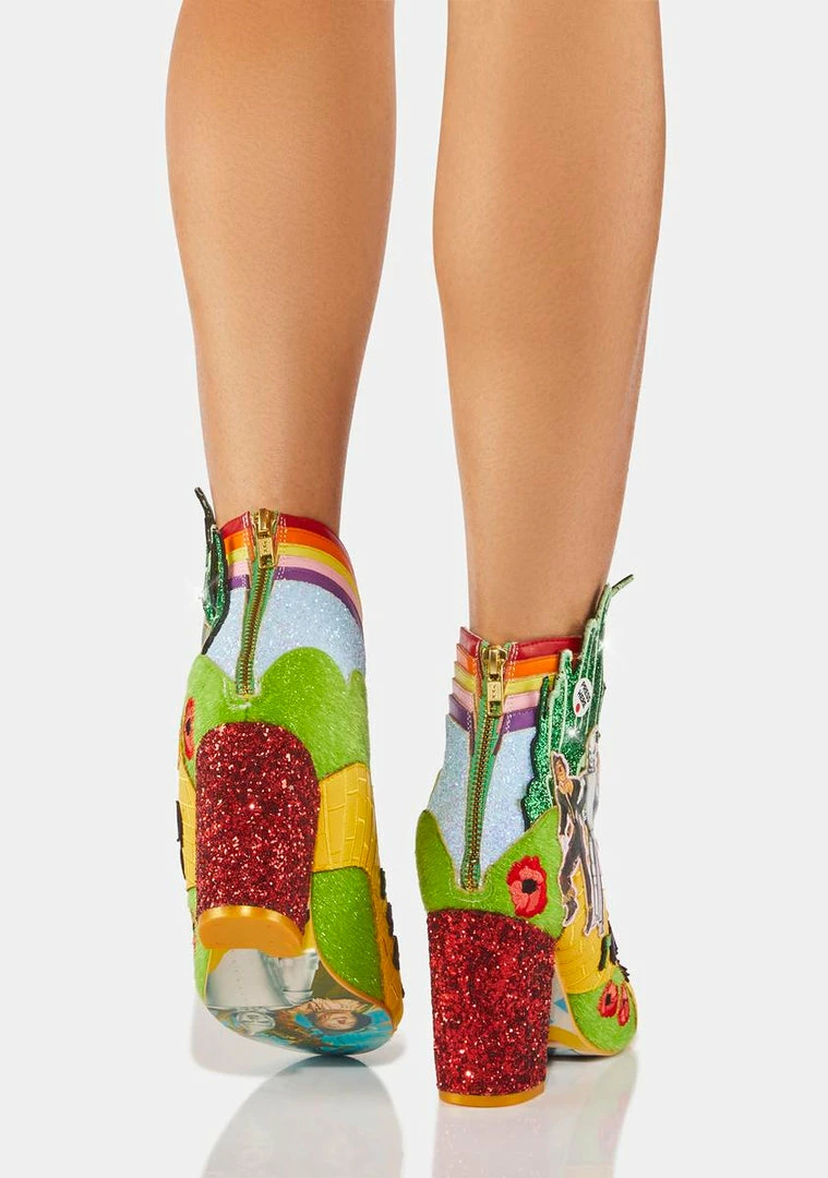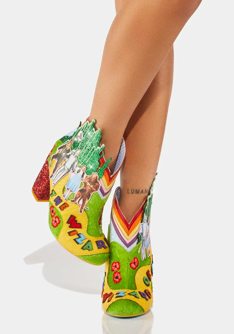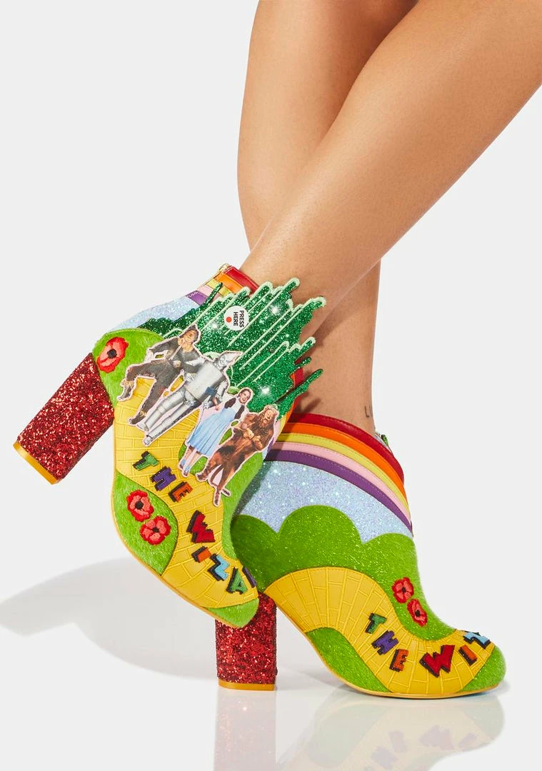 cuz weâre off to see the wizard! Show your love for the classic film in these heeled boots that have a ruby block heel, Dorothy and friends walking to Emerald city appliques on the sides, embroidered poppies, vintage lettering, back zip closures, and even lights up when you walk!