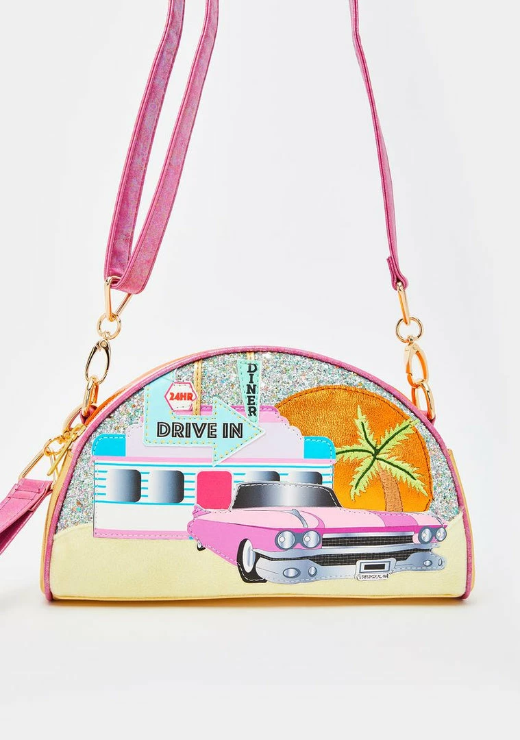 pull up to the bumper baby! Blow up the spot with this cute as eva shoulder bag that has a vegan leather construction with throwback Miami drive-thru graphics all ova, an adjustable strap and a top zip closure.