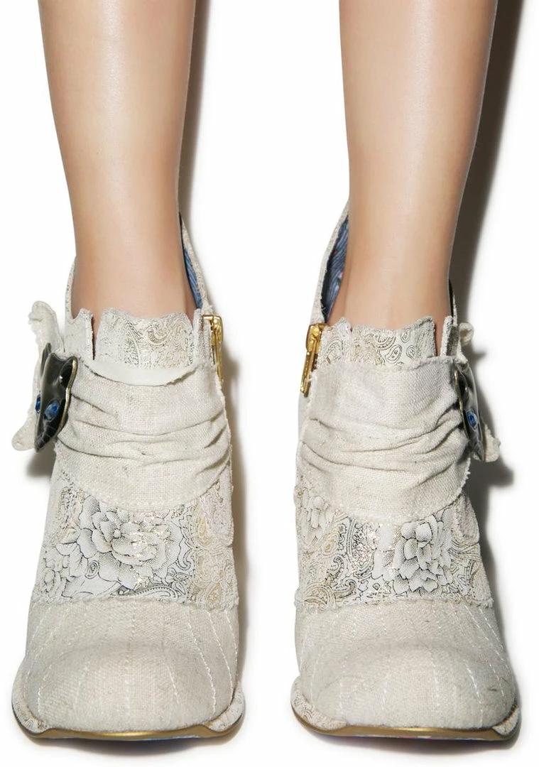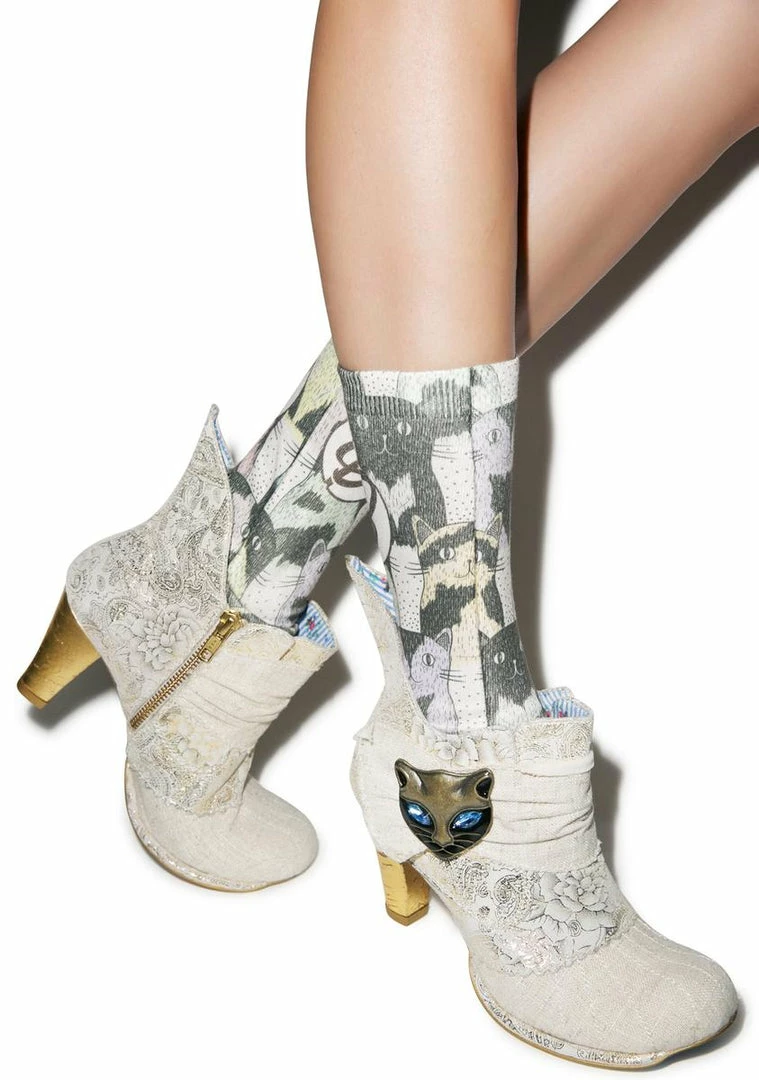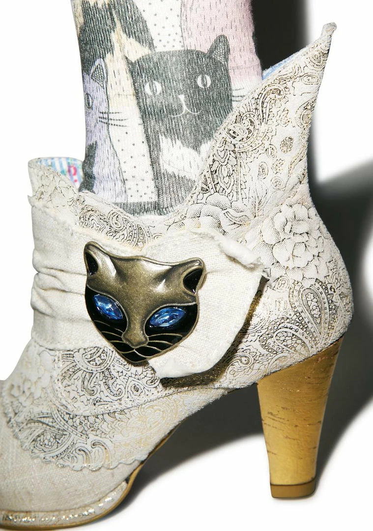 Irregular Choice Miaow Boots, whatÂs up pussycat? These boots know what yer all about cuz they have some serious catittude with their golden cat charm with gleaming sapphire eyes watchin yer every step. Their all over canvas construction gathers around the ankle, and sparkles with a bit of gold that runs throughout the fabric. WIth beautiful floral paisley panels that wrap around the front, and heel cup that comes off the back in a whimsical winged cut. These meowsing shoes are topped off with a golden 3 cork heel, that matches the easy access interior zipper, making these purrfect shoes a must have for all you pussy loverz out there.