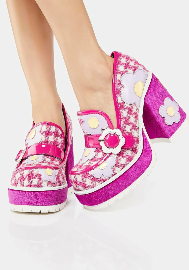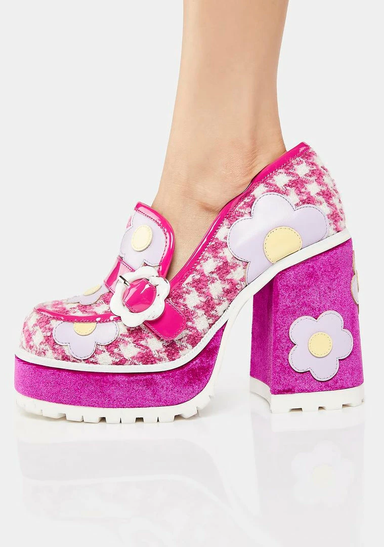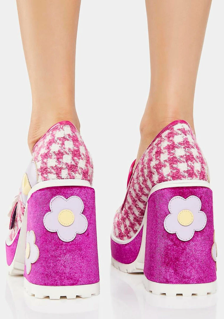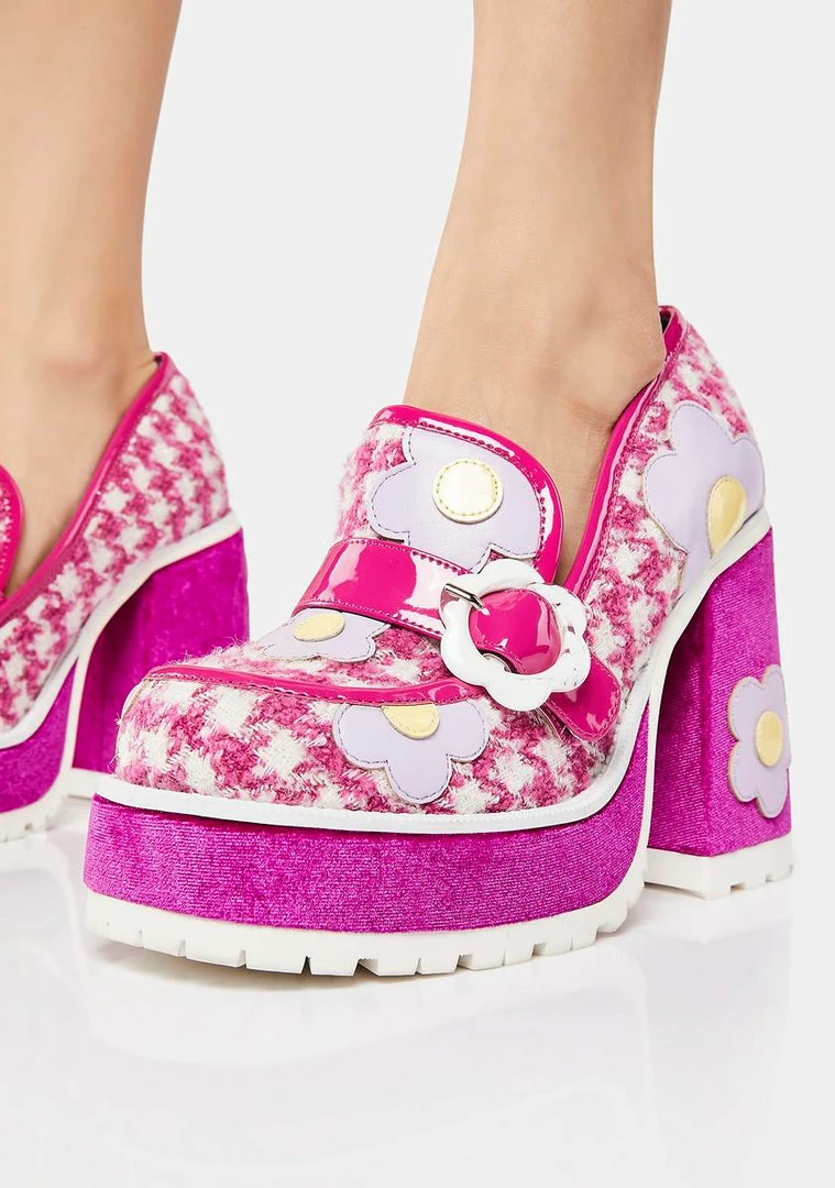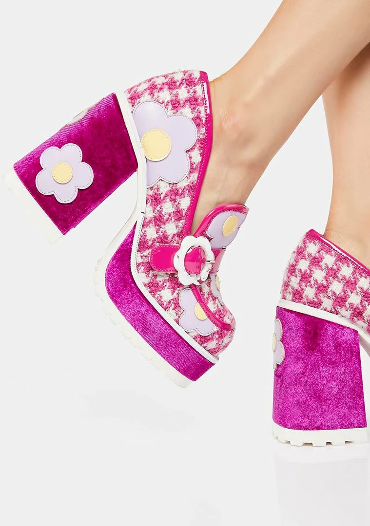 cuz not your average gurl. These platform heels have a faux fur construction, a houndstooth pattern, shimmer platform soles, block heels, a PVC trim, embossed daisies all over, a daisy shaped buckle on the upper, and a slip-on fit.