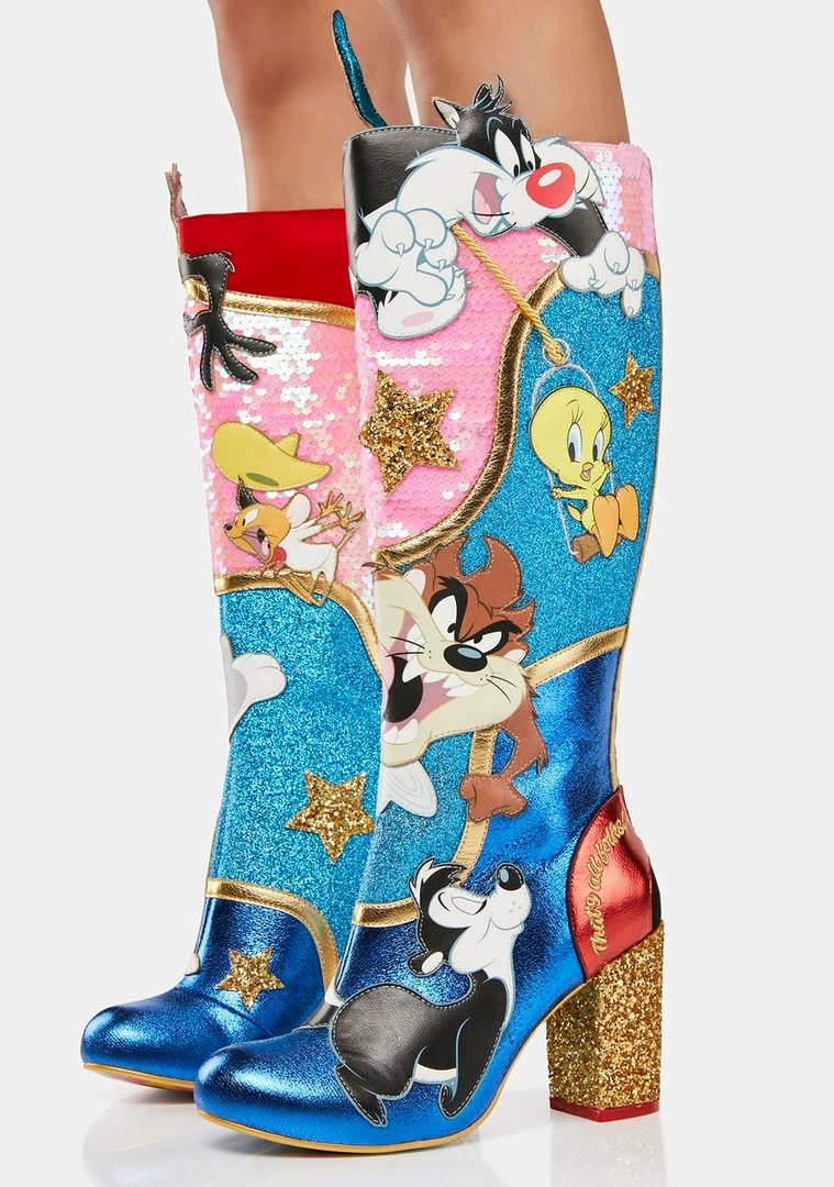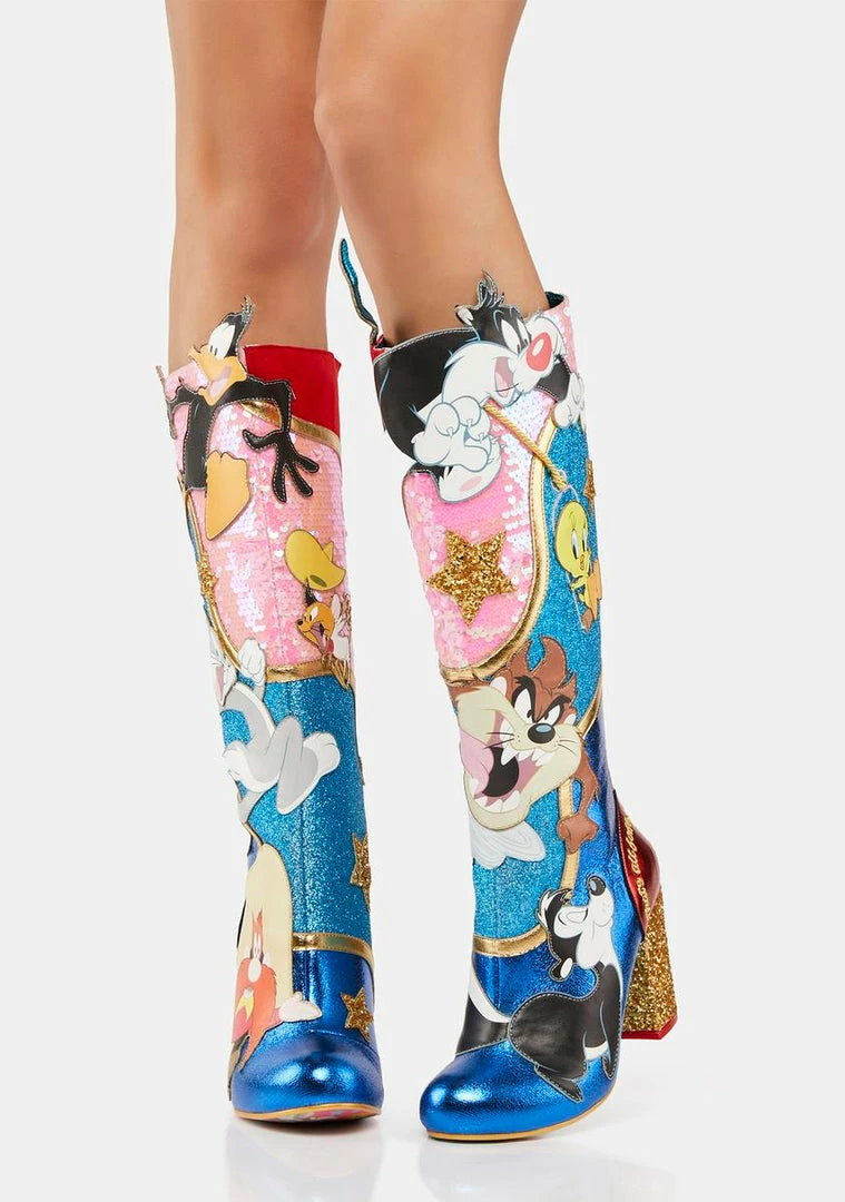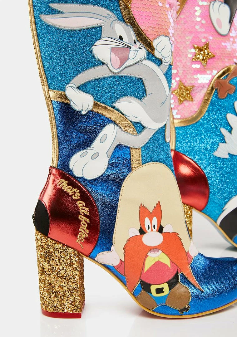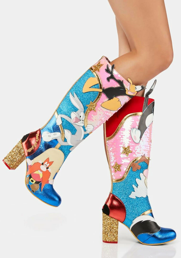 that’s all, folks! These knee-high boots have a vegan leather construction, Looney Toon characters all over, dazzling sequins and glitter, back zip closures, and sparkly block heels.