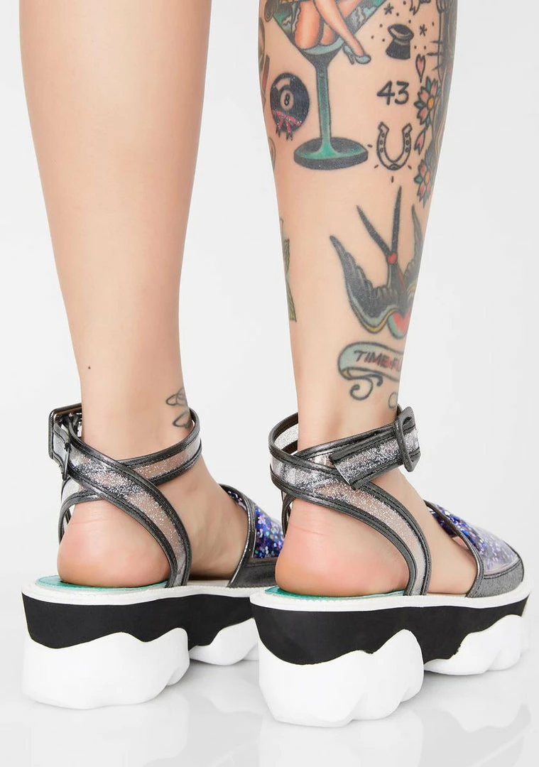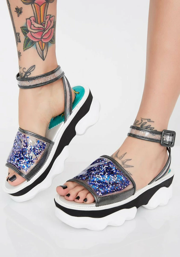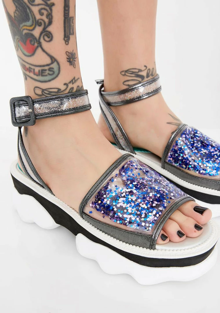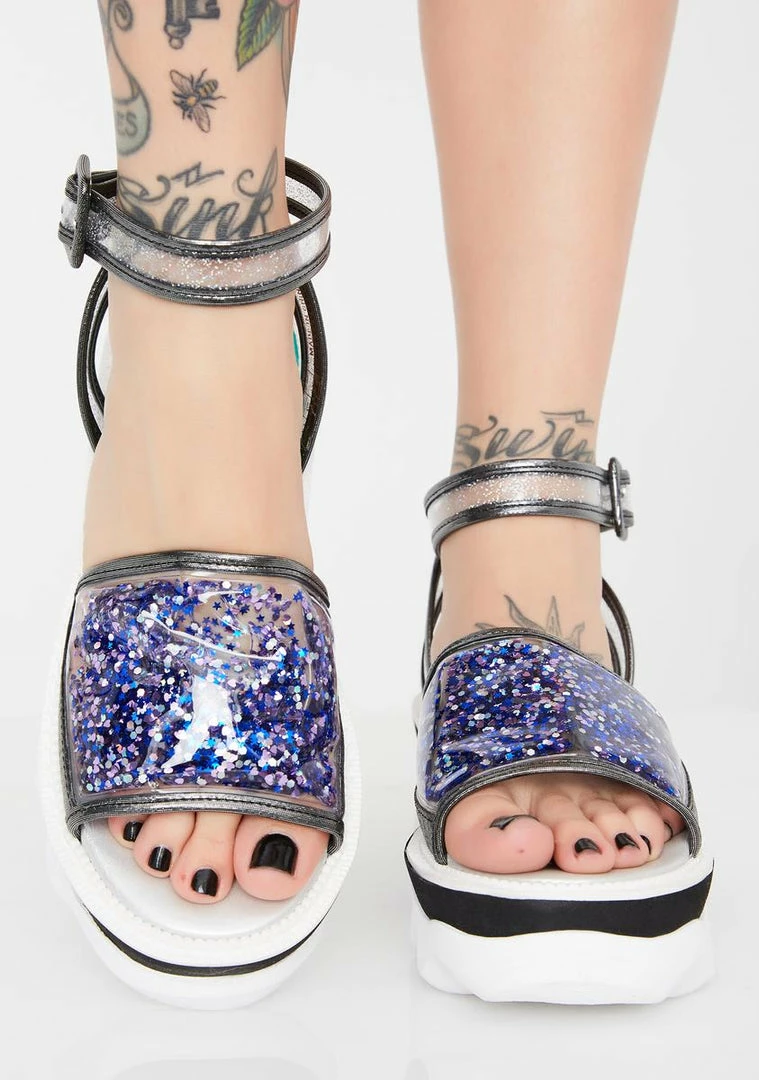 gotcha lookinâ like the pixie queen. Give âem glitter glam in these platform sandals that have glitter infused thicc straps, supa soft footbeds, buckle closures Nâ chunky soles.