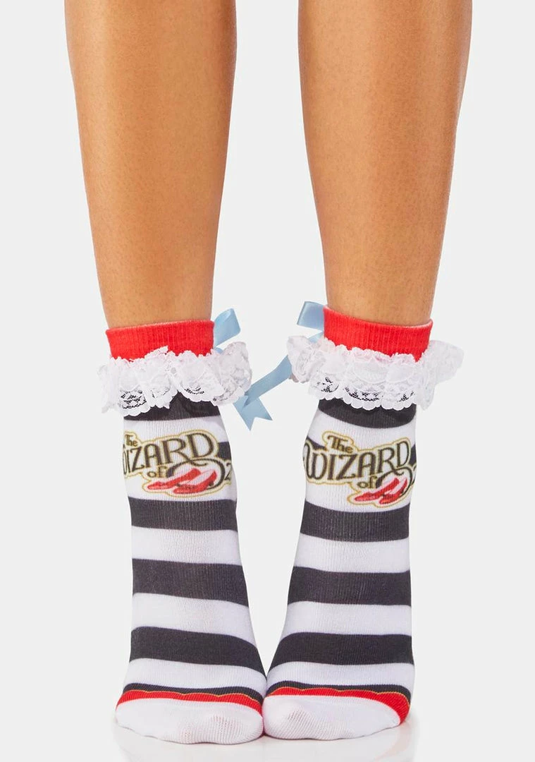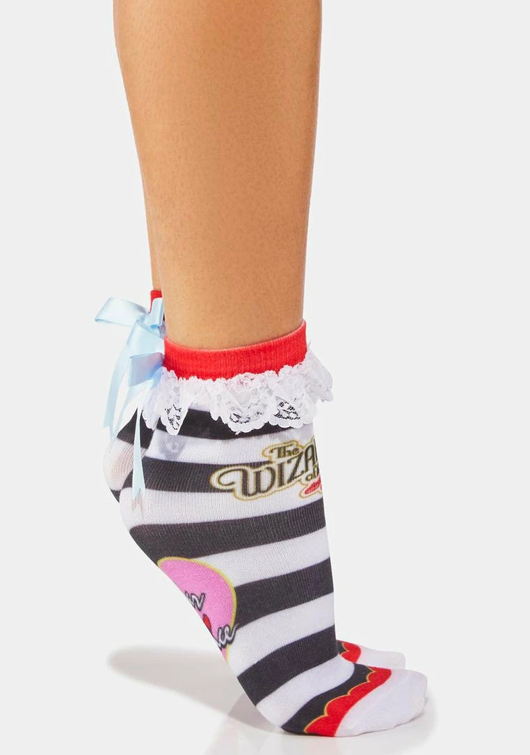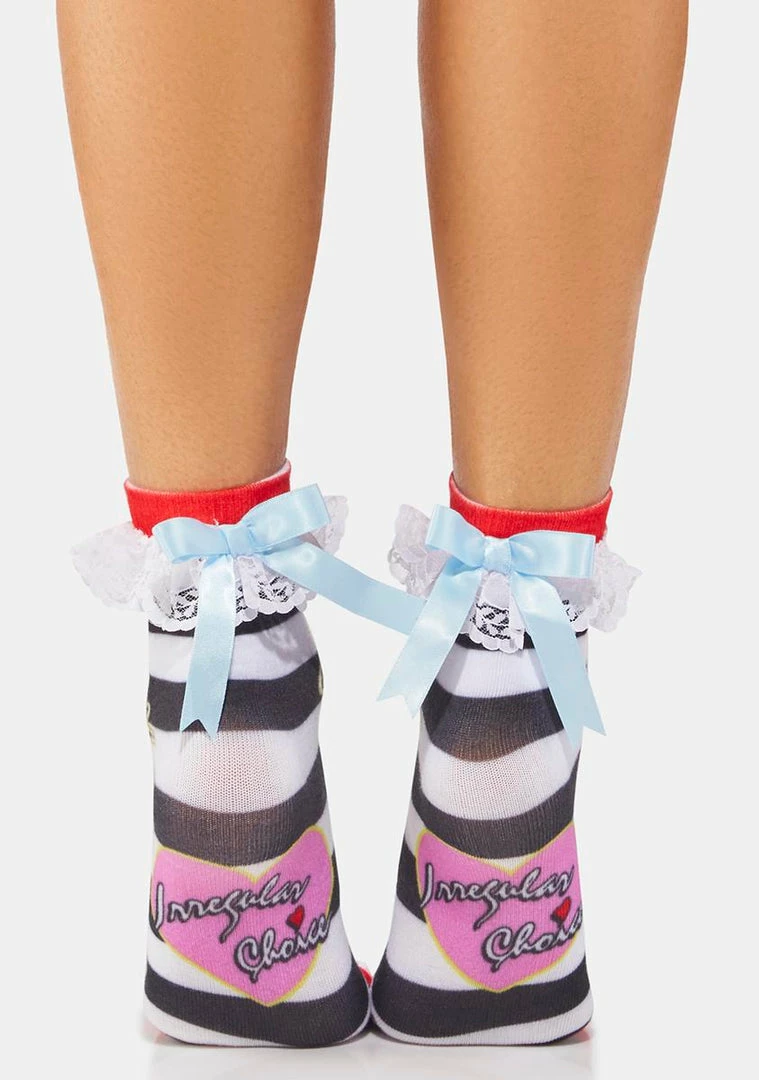 cuz I’m melting! These ankle socks have a striped design, a white lace trim, and a blue ribbon bow in the back.