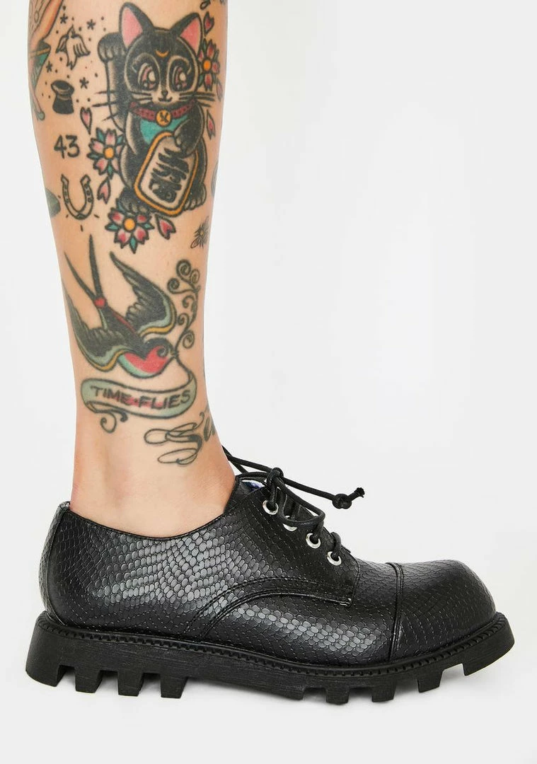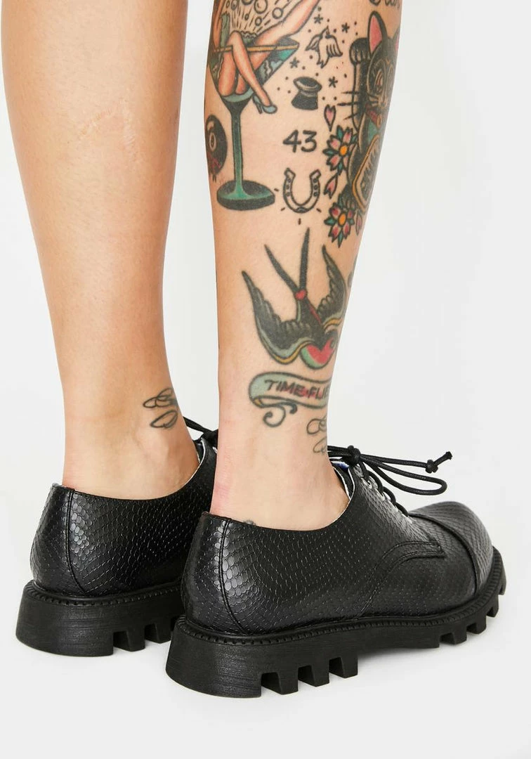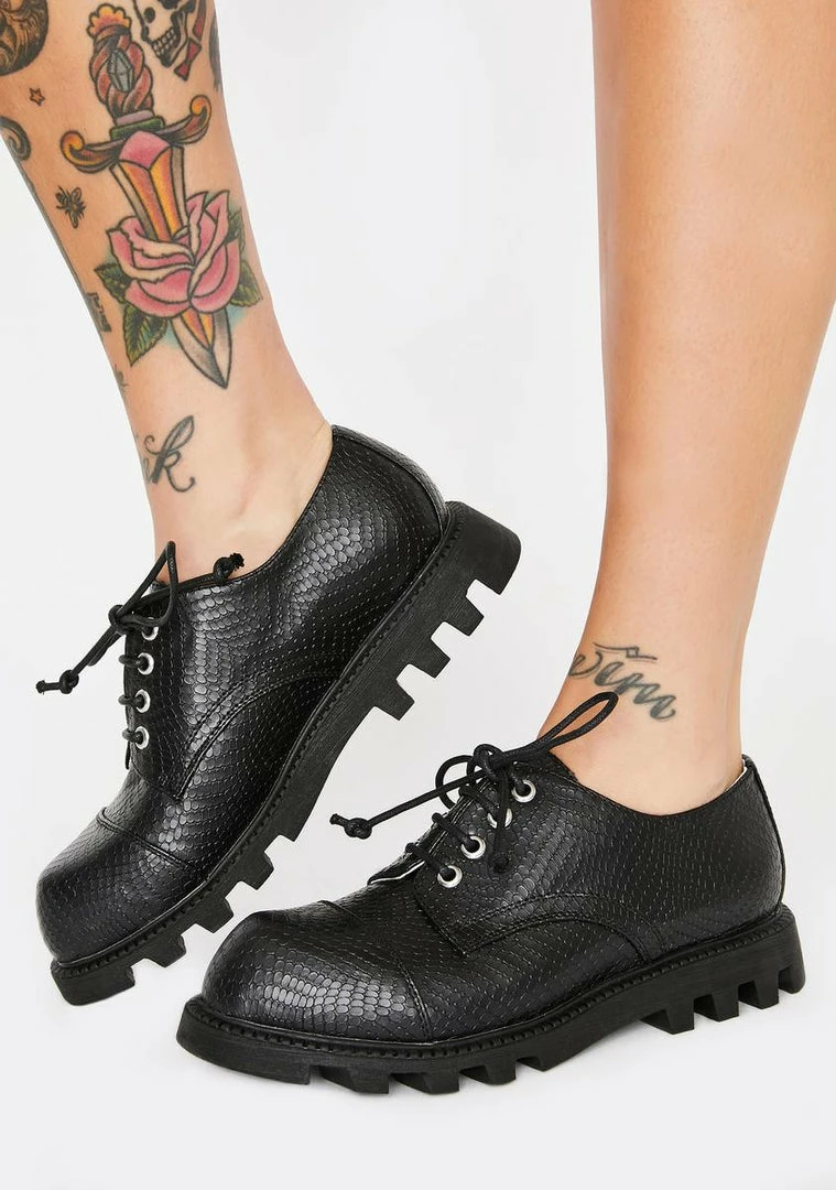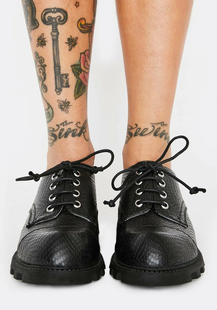 gotcha feelinâ like a boss bish! Turn up the volume in these rad vegan leather oxfords that have a snakeskin texture, chunky treaded soles and adjustable lace-ups.