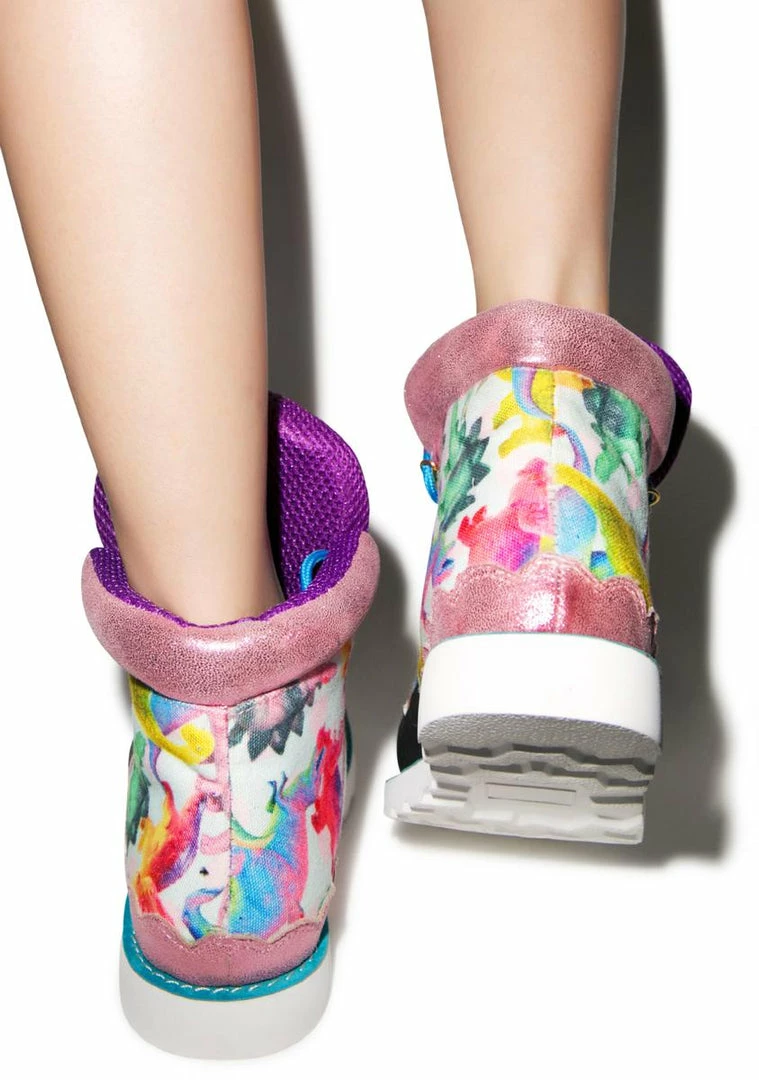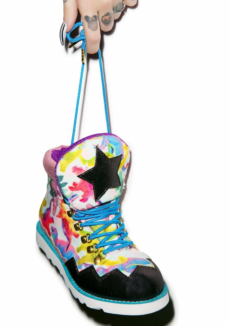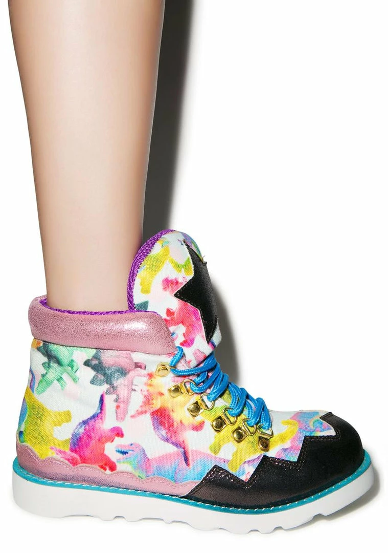 Irregular Choice Touching The Void Boots, because you take it above and beyond! Everyone will be so jelly of yer jurassic style, cuz these lace up kicks are the shit, with their all over neon dino print, and jagged tooth cutout along the rounded toe box that matches the badazz star on the tongue. With sik round laces that match the trim along the molded rubber sole, and contrasting pink iridescent detailing around the heel, and ankle, there isnรยt anything to complain about, especially with the padded interrior that make yer feet feel like they are getting a big olรย hug with every step. So put yer Docs away, cuz these boots are the most amazing thing youรยve seen since the triassic!