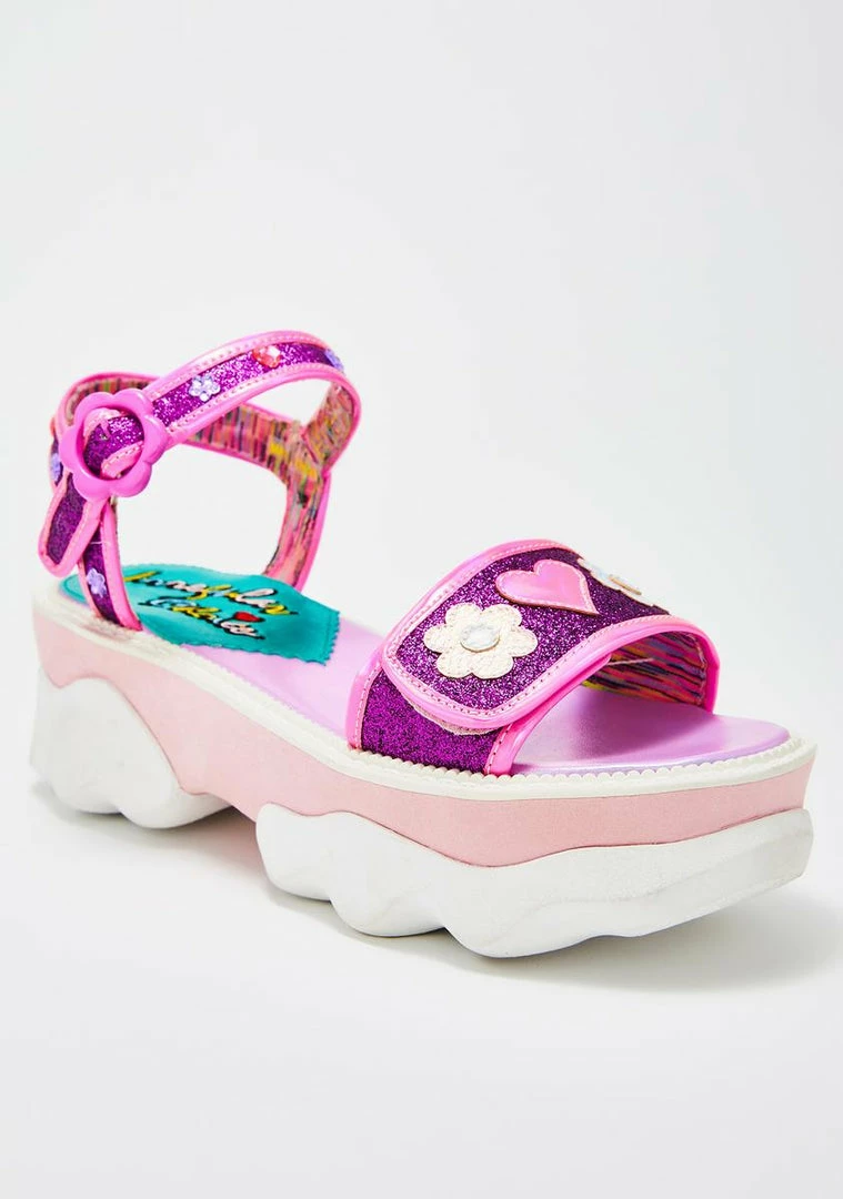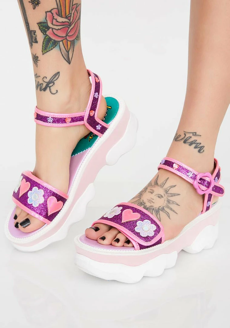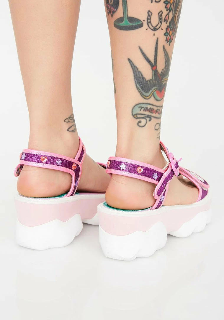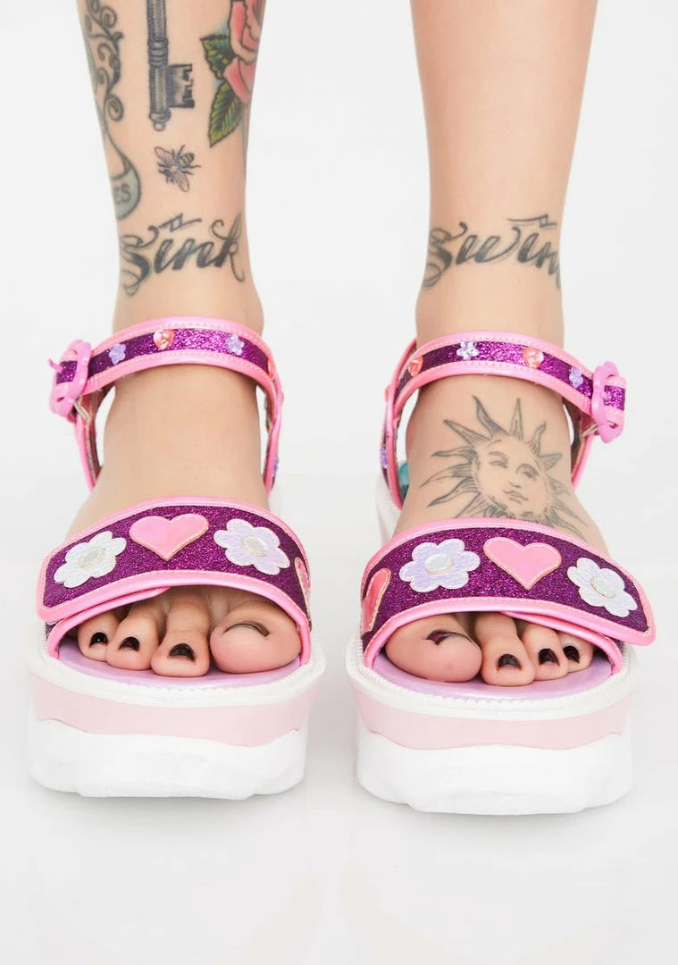 cuz no one can rain on your parade, babe. Youâre all they need Nâ more in these forever shininâ platform slides that have too cute graphic straps, shimmerinâ glitter, and velcro Nâ buckle straps.